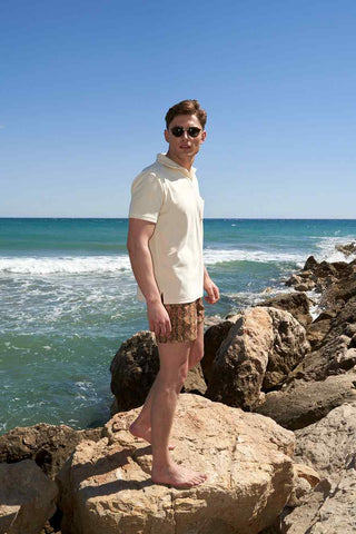 The Asian tailored fit swim short in 100% recycled polyamide. It perfectly co-ordinates with the open neck towelling top.