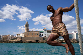 Luxury tailored shorts and swimwear in 100% recycled fabrics in sophisticated joyful prints